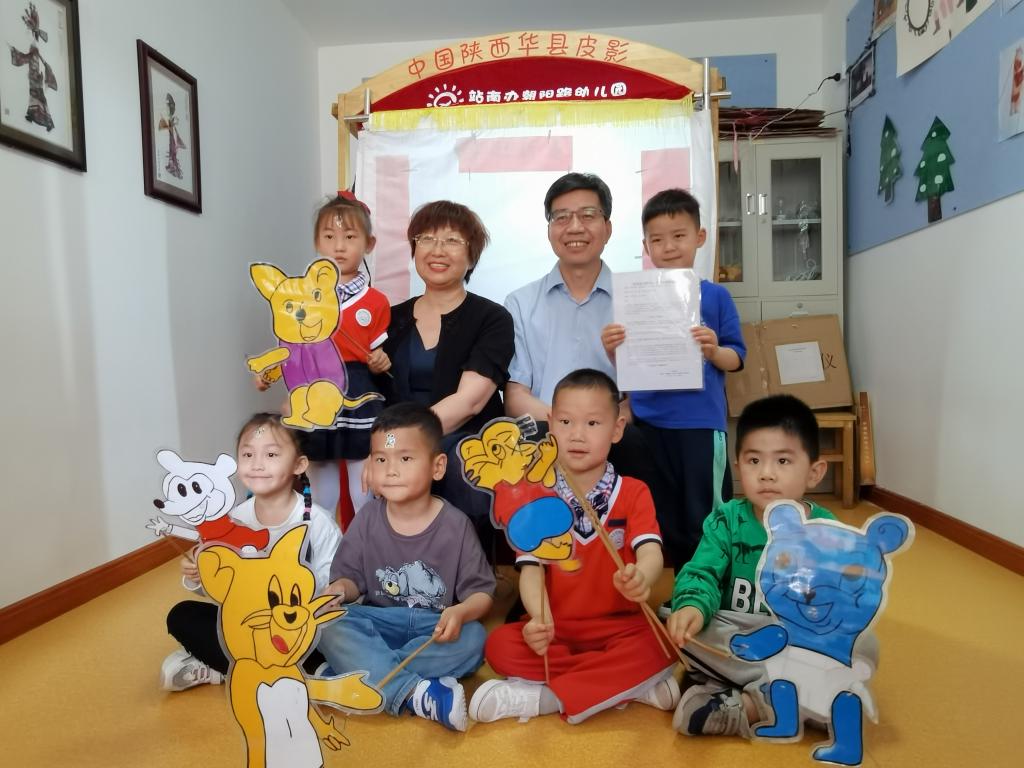 在站南办朝阳幼儿园,靳华锋饶有兴趣地观看了小朋友表演的皮影节目,向园方介绍了公司在建的“中华优秀传统文化传承基地——渭南皮影艺术”项目,期待双方在中华优秀传统文化进校园、人才培养等方面加强交流合作。