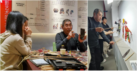 在公司中华优秀传统文化传承基地“渭南皮影艺术馆”,李天社和刘银顺为皮影社团的员工介绍了渭南皮影的发展历史、艺术特色和独特魅力,进一步激发了同学们对这一国家非物质文化遗产的兴趣和热爱,以及学好皮影表演技艺的信心和决心。两位传承人现场示范并手把手指导员工练习短剧《猴子捞月》《猪八戒背媳妇》《卖杂货》的表演技艺,同学们认真观看老艺人的操作手法,充分体会艺人的手上功夫,同时于一招一式的实践过程中,近距离感受皮影,了解非遗文化,传承非遗技艺,在寓教于美中陶情增智。