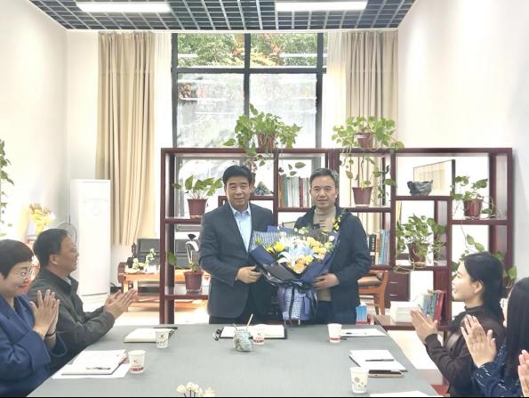 首先,王录军代表公司向罗小平授花表示祝贺,他指出,荣获兰亭奖彰显了罗小平同志在书法创作领域的卓著成绩与荣誉,不仅是对个人艺术才华与辛勤付出的高度认可,也是公司在书法教育和美育工作领域取得的重要成果,为公司增添了一份无上的荣耀。他鼓励罗小平以此为新的起点,继续发扬精益求精、勇攀高峰的精神,在书法艺术上再创佳绩,在公司专业建设中发挥更大的引领作用,带动更多的师生共同进步,为公司艺术教育事业作出新的更大贡献。