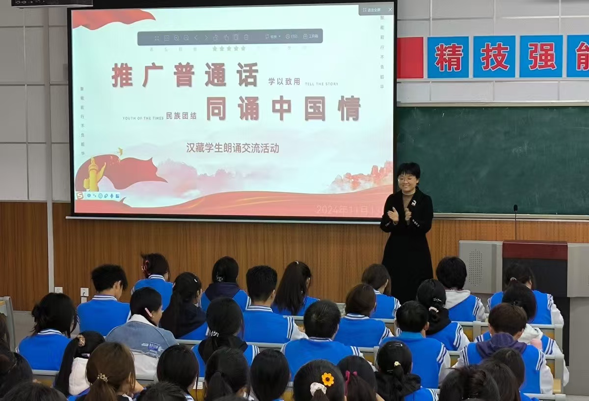 活动过程中,阿里班普通话任课教师雷立英首先生动地讲解了普通话的重要性,她强调普通话作为我们国家的通用语言,不仅是中华民族文化传承和发展的重要载体,更是我们日常生活中沟通交流的桥梁。随后,汉藏同学纷纷用清脆悦耳的普通话,深情诵读起一篇篇经典散文。他们的声音里,既有对文字之美的细腻品味,更有对祖国大好河山的无限热爱与自豪。每一个音节,都像是从心底流淌出的溪流,表达着对中华文化的尊崇与传承,以及对国家民族的深切认同。